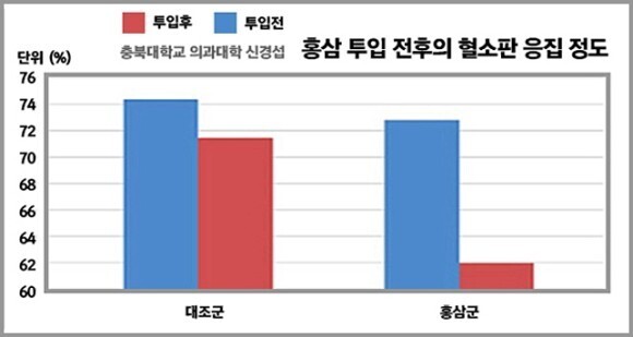 충북대학교 신경섭 박사팀도 홍삼이 건강에 좋은 음식임을 밝혔습니다. 박사팀은 고지혈증 환자들을 둘로 나눠 홍삼과 가짜 약을 각각 섭취토록 했습니다. 그런 다음, 혈전 발생에 영향을 미치는 혈소판의 응집도 차이를 살폈습니다.