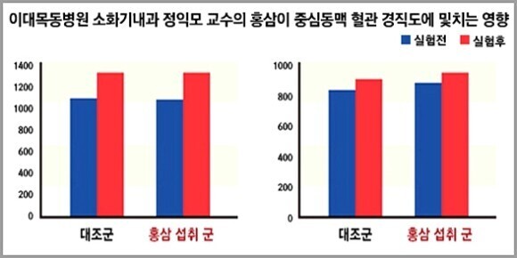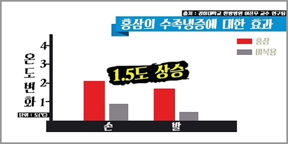 그 결과 손발의 온도가 홍삼 섭취 전과 비교해 1.5℃ 이상 상승한 것으로 나타났습니다. 이에 대해 이 교수는 "홍삼이 혈액순환을 촉진해서 심장에서 멀리 떨어진 손발까지 피를 원활하게 공급한 것으로 보인다"고 말했습니다.