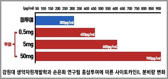 강원대학교 생약자원개발학과 손은화 박사팀은 전임상시험을 통해 홍삼 섭취가 면역력 증진에 효과적이라고 밝혔습니다. 손 박사팀은 실험용 쥐를 네 그룹으로 나눠 그중 세 그룹에 각각 0.5mg/kg, 5mg/kg, 50mg/kg의 홍삼 추출물을 6주간 투여했습니다. 이후 T세포와 대식세포에서 생산되는 면역물질인 IL-6의 분비량 변화를 살폈습니다.