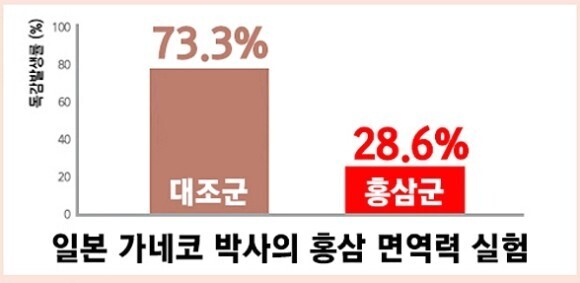 한편 가네코 박사팀은 임상시험을 통해 홍삼 섭취가 바이러스의 활동을 억제하는 효과가 있다고 밝혔습니다. 박사팀은 건강한 성인들을 두 그룹으로 나눠 한 그룹에는 홍삼을, 다른 한 그룹에는 위약(가짜 약)을 섭취하도록 한 뒤 그룹별 독감 발병률을 비교했습니다. 그 결과 위약 섭취 그룹에서는 독감에 걸린 비율이 무려 73.3%에 달했습니다. 반면 홍삼 섭취 그룹의 독감 발병률은 28.6%에 그쳤습니다.