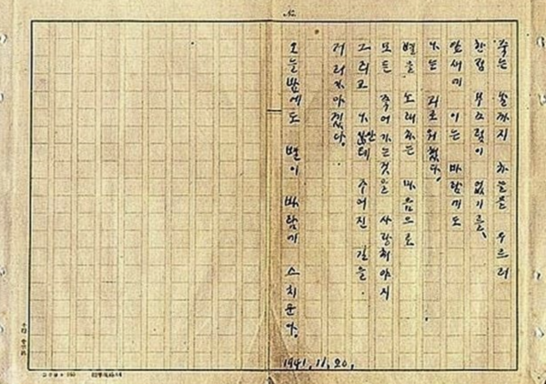 무력감, 상심, 분노가 쌓여갈수록 윤동주는 시를 썼습니다. 원고지는 사춘기 소년의 속내를 털어놓을 친구와도 같은 존재였지요.