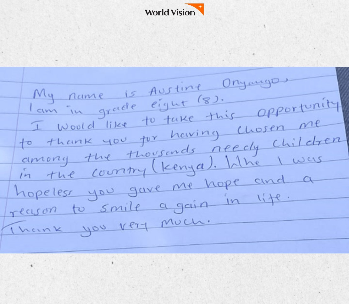 안녕하세요, 저는 오스틴입니다. 저는 지금 8학년이에요. 케냐에 도움이 필요한 많은 아이들이 있는데, 그중에 저를 후원해 주시고 이런 기회를 얻게 해 주셔서 감사해요. 제가 절망 속에 있을 때 후원자님이 저에게 희망을 주셨고, 다시 웃을 수 있게 해 주셨어요. 정말 감사드려요!