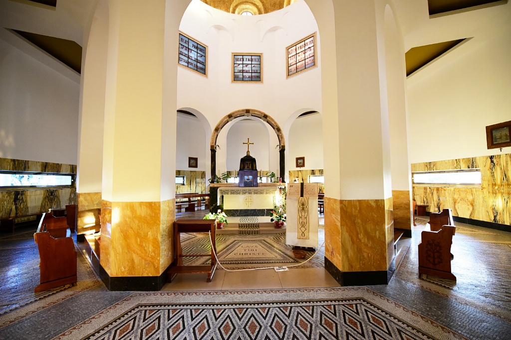 야외 제대 뒤에 교황 바오로 6세가 방문하여 "그리스도의 식탁"에 친구하는 모자이크 액자가 있다.