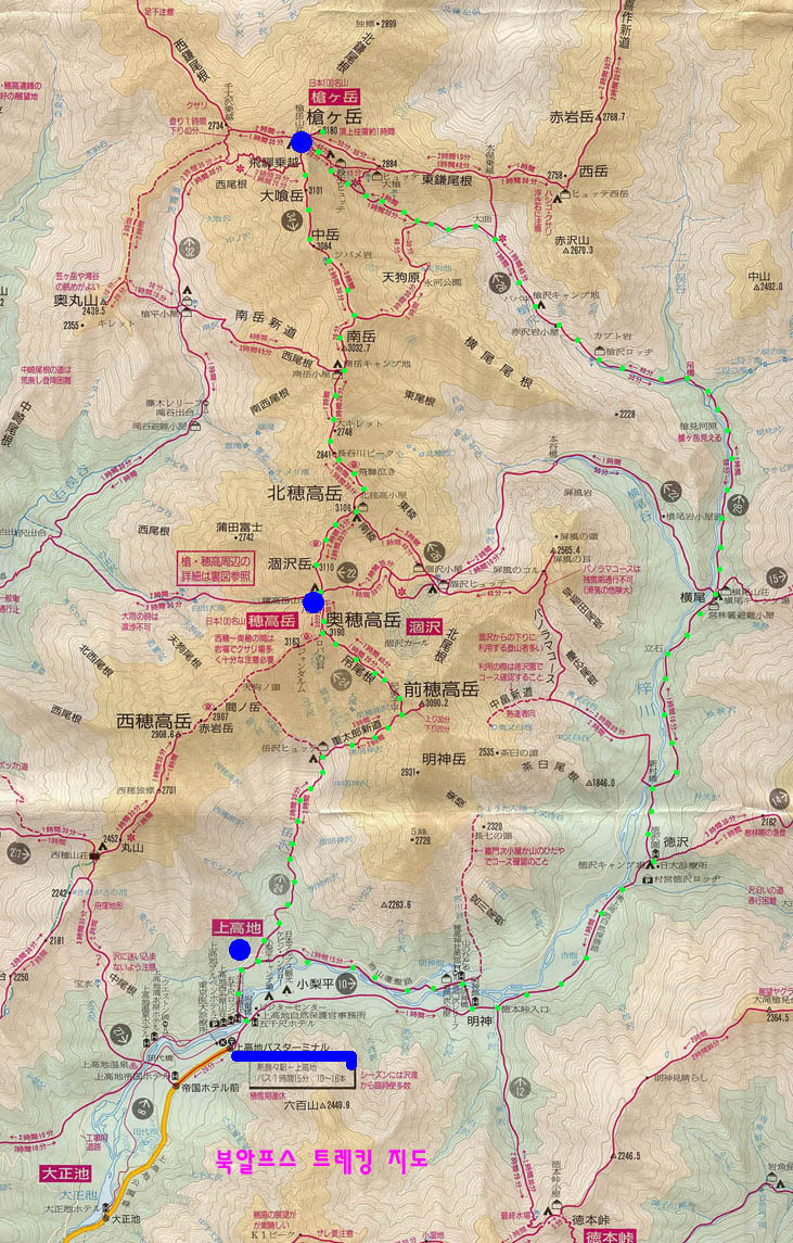 북알프스는 오쿠호다카다케(3,190m)를 주봉으로 가레사와다케(3,110m), 미나미다케(3,033m) 등과 함께 호다카라는 산군을 이루고 있다. 오쿠호다카다케는 후지산, 기타다케에 이어 일본 3위의 높이로 북알프스는 전체적으로 웅장한 암산의 형태를 띠고 있다.