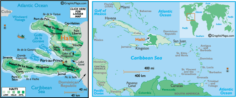 아이티는 대 안틸레스 제도의 서쪽 지역에 있는 섬으로서 두 번째로 큰 섬이다. 아이티는 쿠바와 도미니카 공화국을 이어 세 번째로 큰 섬나라이다. 쿠바와는 80km밖에 떨어져 있지 않다. 아이티의 지형은 산세가 드센 편이고 해안 지대에는 작은 평원과 강, 계곡이 있다. 가장 큰 농업 생산지이자 비옥한 계곡은 Plaine de l'Artibonite이다. 섬의 중앙과 동부 지역은 높은 고원이 있다. 가장 높은 곳은 픽 라 세예(Pic la Selle)로서 2,680 m이다. 도미니카 공화국과는 360km의 국경을 접하고 있다.