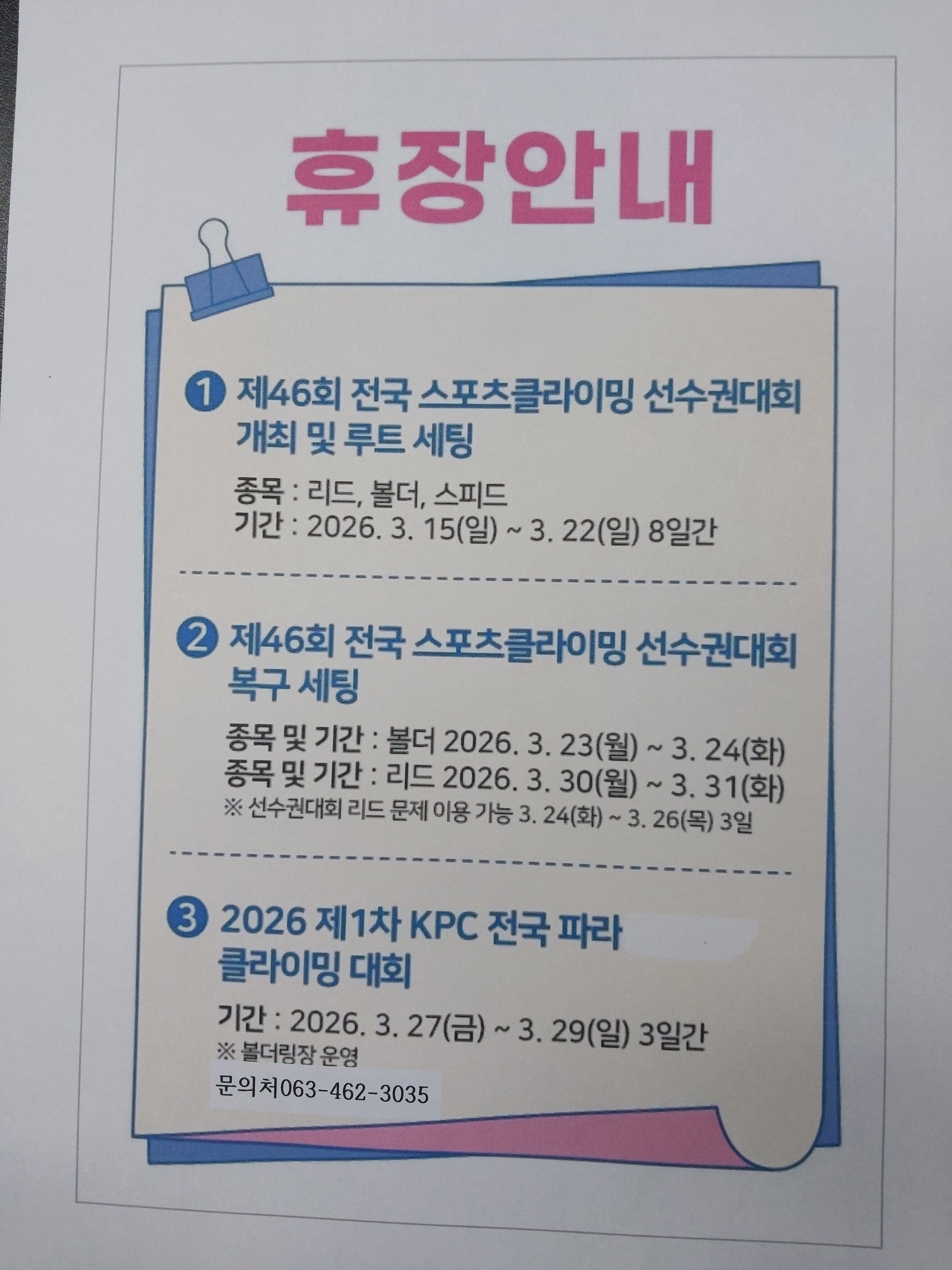 군산 인공암벽장 휴장안내 작성자땡겨|작성시간26.03.11|조회수352 목록 댓글 0 글자크기 작게가 글자크기 크게가 다음검색 현재 게시글 추가 기능 열기 북마크 공유하기 신고 센터로 신고 댓글 댓글 0 댓글쓰기 답글쓰기 댓글 리스트