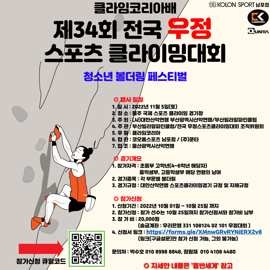 1. 대 회 명 : 클라임코리아배 제34회 전국 우정스포츠클라이밍 대회