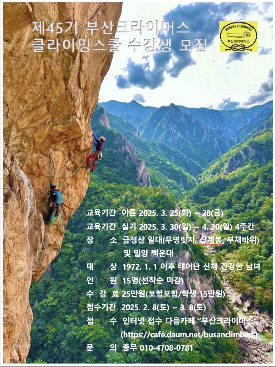 2025년 제 45회 부산크라이머스 클라이밍스쿨 교육생 모집 작성자날들|작성시간25.02.13|조회수215 목록 댓글 0 글자크기 작게가 글자크기 크게가 https://m.cafe.daum.net/busanclimbers/V2SE/397? 다음검색 현재 게시글 추가 기능 열기 북마크 공유하기 신고 센터로 신고 댓글 댓글 0 댓글쓰기 답글쓰기 댓글 리스트