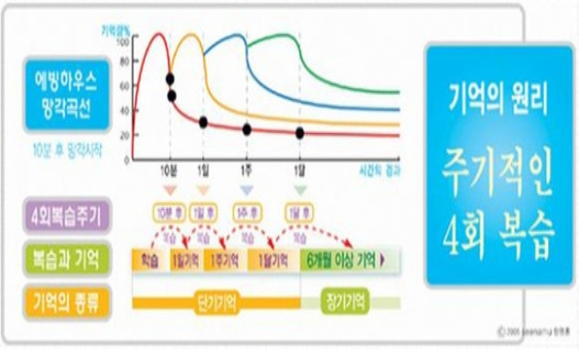 주: 한 단어의 첫 노출 뒤에 5초 후 두번 째 노출을 주고 이후 25초 후 세번 째 노출, .....9회 노출 후에는 113일 정도 후에 10번 째 노출을 주면 장기기억이 가능하다. 그 이유는 다시 노출을 주는 시점이 점점 기억이 쇠퇴하여 기억의 60%가 남아있을 때이고 이때 재노출이 주어지면 다시 100%의 기억으로 회복이 되기 때문이다. 이상적인 노출의 간격은 위와 같고 이와 비슷한 스케줄로 진행되면 가장 이상적인 반복학습이 가능하다.