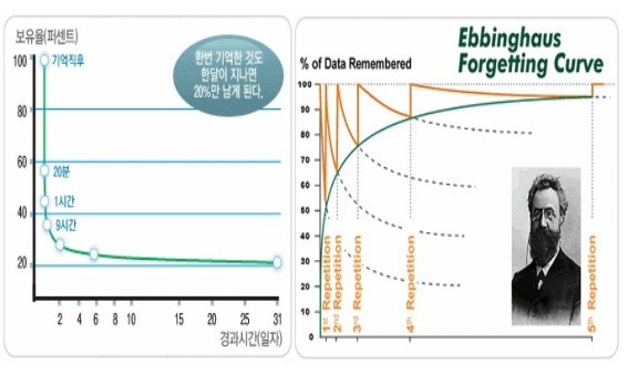그는 16년간 기억을 연구해서 그 유명한 에빙하우스의 ‘망각곡선’이라는 탄생시켰습니다. 그는 “시간이 지나면 지날 수록 더욱 빨리 우리들의 기억은 사라진다.”는 것은 과학적 실험을 통해 증명했습니다.