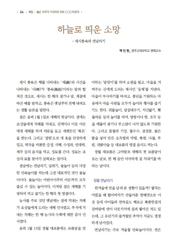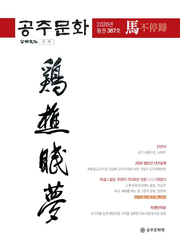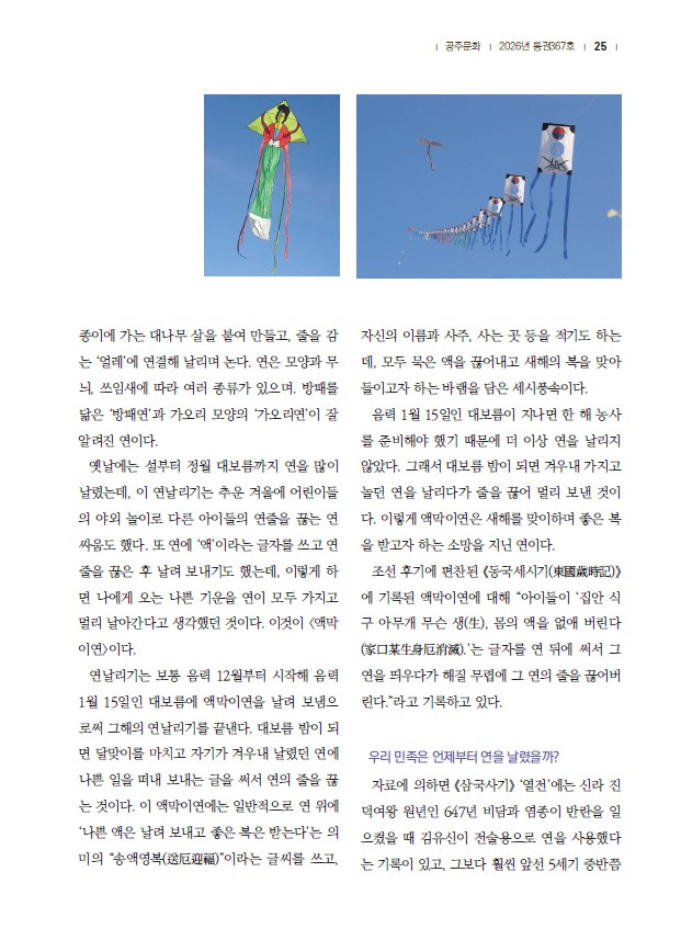2026 새아침. < 하늘로 띄운 소망 > - 세시풍속과 연날리기 : 송계산방 백인현미술관 작성자송계산방주인|작성시간26.01.29|조회수5 목록 댓글 0 글자크기 작게가 글자크기 크게가 ** 공주문화원 소식지 ** 2026년 2월호 (통권 367호)특집_-_< 설날, 우리가 기다리던 것은 0 0 0 이었다 > 다음검색 현재 게시글 추가 기능 열기 북마크 공유하기 신고 센터로 신고 댓글 댓글 0 댓글쓰기 답글쓰기 댓글 리스트