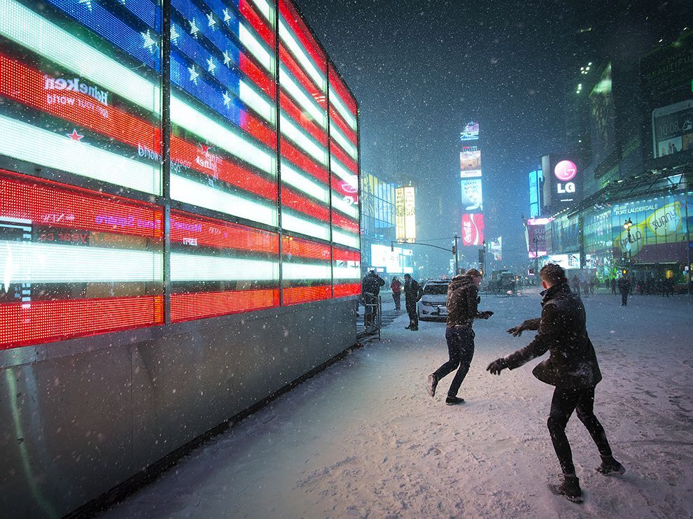 미국 뉴욕 타임스퀘어에서 눈싸움 하는 사람들