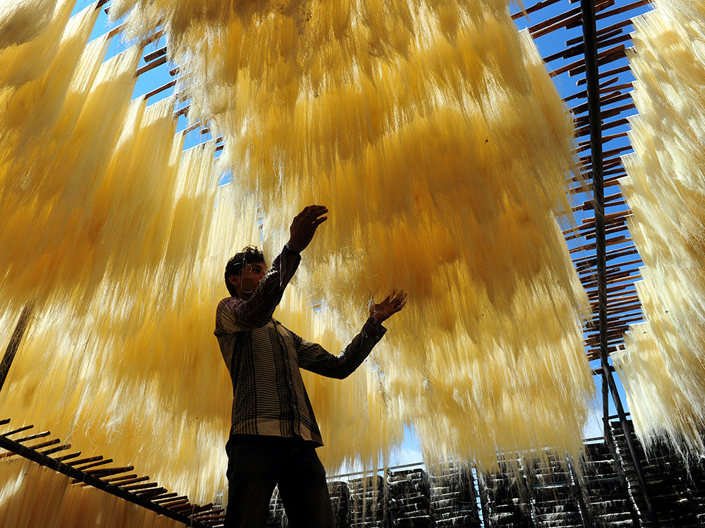 이슬람교 라마단 축제 기간 동안 당면을 만드는 인도인