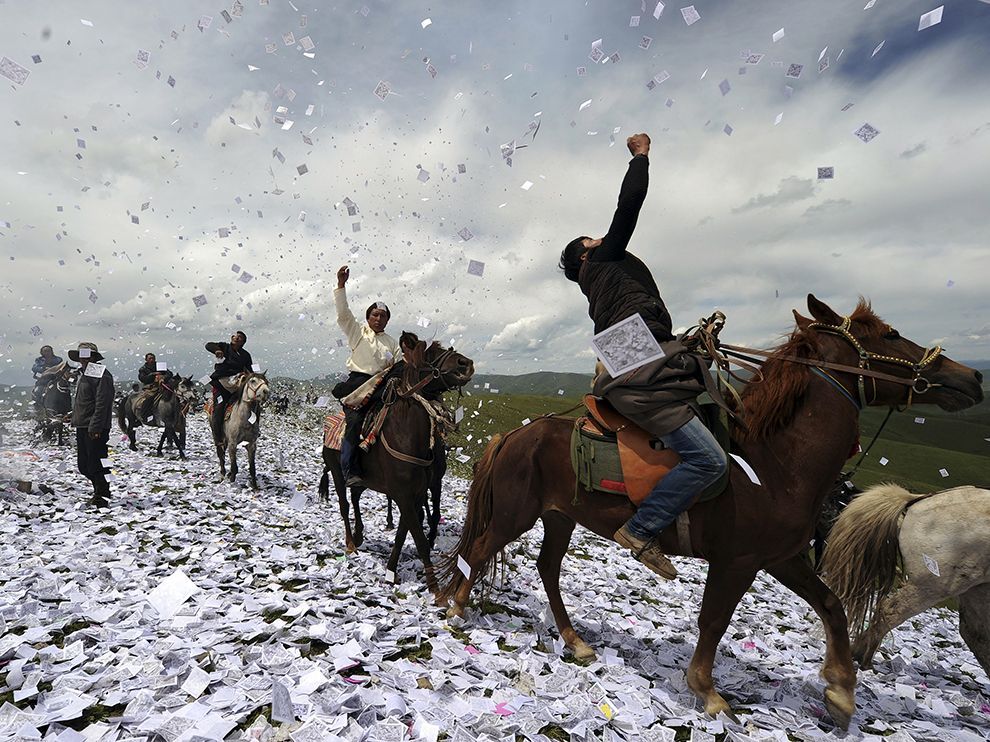 동부 티베트의 한 축제에서 종이 룽따(기도문이 적힌)를 뿌리는 사람들