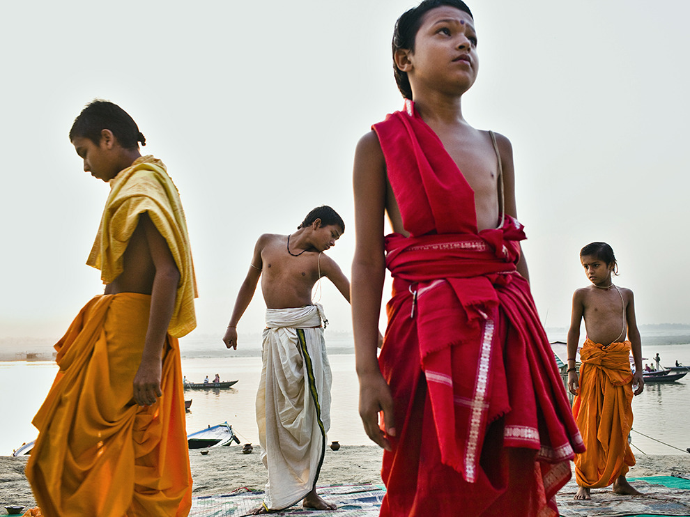 인도 바라나시의 갠지즈강에서 요가 연습을 하는 소년들