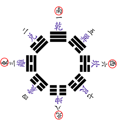 남쪽을 바라보면 위에는 하늘이 있어 건(乾)이고 아래는 땅이 있어 곤(坤)이다. 그래서 건(乾)은 위에 배치했고 곤(坤)은 아래에 배치했다.
