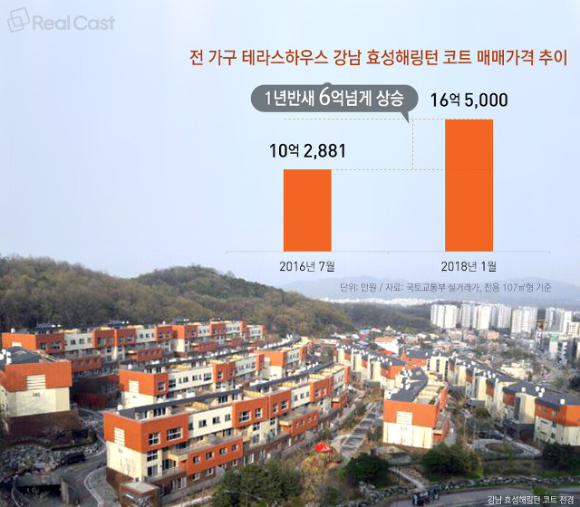 찾는 수요가 늘어나다 보니 집값도 뛰었습니다. 입주 3년차(2016년 4월 입주)에 접어든 강남권 최초의 테라스하우스인 강남구 세곡동 보금자리주택지구에 위치한 ‘강남 효성해링턴 코트’가 그 예인데요. 국토부 실거래가 정보에 따르면 입주년도인 2016년 7월만해도 10억2,881만원에 거래되던 이 단지 전용 108㎡형이 올 1월에는 16억5,000만원에 팔려나갔습니다. 1년반만에 6억넘게 가격이 뛴 거죠. 현재 매매 평균시세도 4달 전(14억3,000만원)보다 1억을 웃도는 15억5,000만원에 형성되어 있고 매물도 거의 없다고 합니다. 작년 2월부터 입주를 시작한 ‘광교파크자이더테라스’도 그렇습니다. 7달 전인 작년 말경만해도 평균 매매 실거래가 7억1,000만원 수준이었던 이 단지의 최근 매물 평균은 8억2,500만원 선입니다. 실제로 전용 107㎡형이 지난 3월 8억6,700만원에 실거래된 바 있고요.