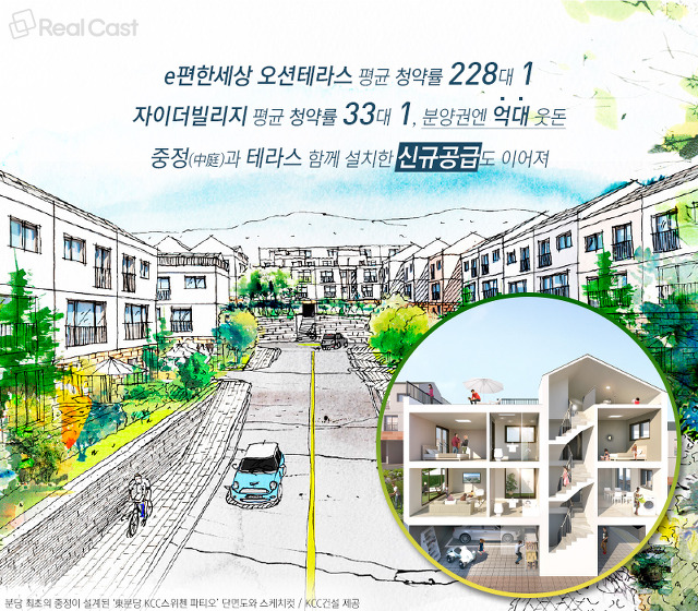 이에 앞서 작년 3월과 5월 김포한강신도시에서 선보인 전 세대 개인정원과 테라스를 갖춘 블록형 단독주택 ‘자이더빌리지’와 ‘라피아노’의 경우도 각각 평균 33대 1, 65대 1의 높은 청약률을 기록하고 조기 완판됐고요. 자이더빌리지 분양권엔 현재 1억 넘는 웃돈도 붙어 있답니다. 성남 도촌지구에서 6월 말 분양을 앞둔 분당권 최초 블록형 단독주택 ‘동분당 KCC스위첸 파티오’도 총 203세대 모두에 개별정원은 물론 테라스를 설계하고 분당권 최초로 햇빛과 바람이 집안으로 들어오는 중정(中庭∙일부세대 제외)을 설치해 그 인기를 이어갈 계획이고요.