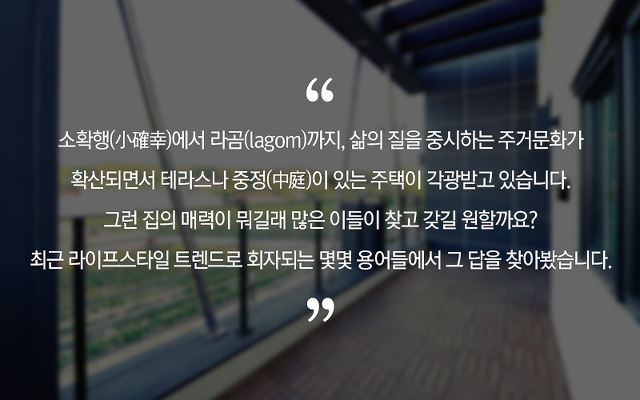 지금 시대의 집은 소확행을 경험하는 플랫폼으로 무한 변신 중입니다. 또한 자연을 벗삼아 일상의 여유를 누리기에 좋은 중정과 테라스가 안식과 힐링이 화두가 되는 작금의 시대에 우리를 매혹시키고 있는 것도 사실입니다. 작지만 확실한 행복 추구의 시발점이 되기에 충분한, 매력적인 공간이기에 앞으로 더욱 그 수요도 늘어나겠죠. 이것이 바쁜 일상을 살아가는 현대인들이 중정주택이나 테라스하우스에 열광하고 로망하는 이유이자 확산될 것이라 전망하는 이유입니다. *
