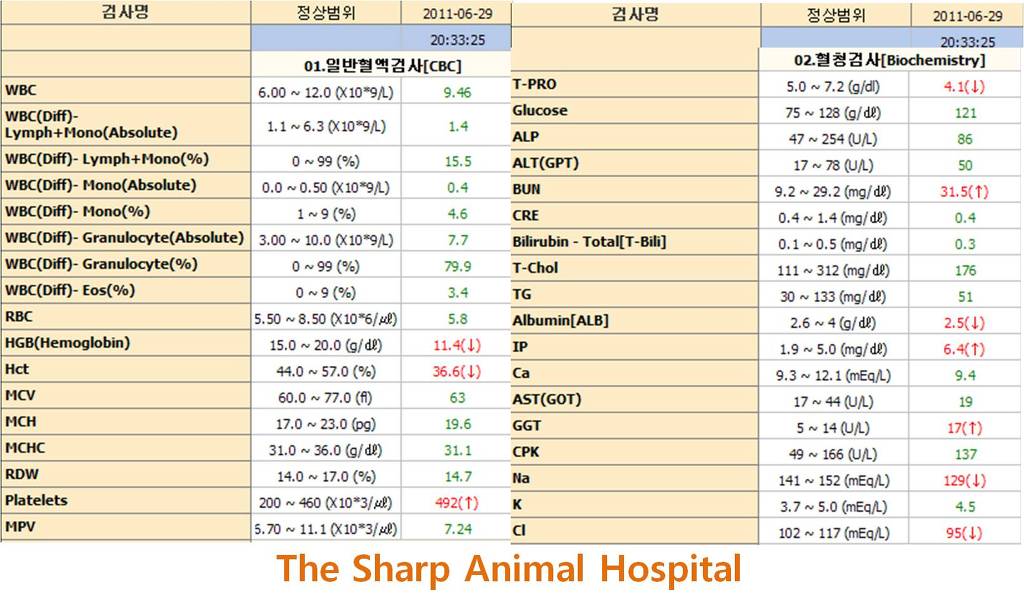 혈액검사상에서는 약간의 영양 불량 상태와 신장수치 증가 담낭수치 증가