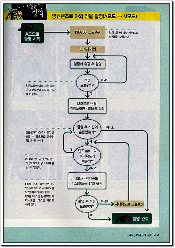 그러나 기본적으로 자기 카메라의 조작방법을 알고 활용할수 있는 기능을 익히면 되는것이며, 일반적으로는 반자동모드(P,S,A)를 잘 활용하고 실내라던가 어둡거나 역광등 특별한 경우의 대처법등을 이용할줄 안다면 실제로 사진을 찍는데 충분합니다.