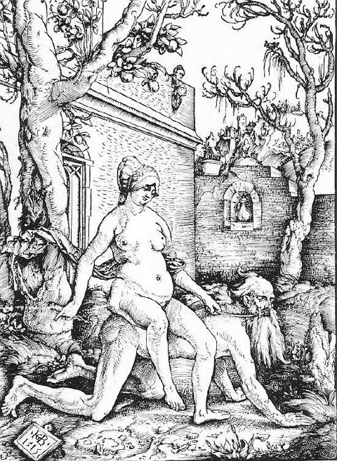 | 성안 정원에서 벌거벗은 필리스가 늙은 아리스토텔레스의 등에 올라타 채찍으로 엉덩이를 때려 앞으로 몰고 있고 |