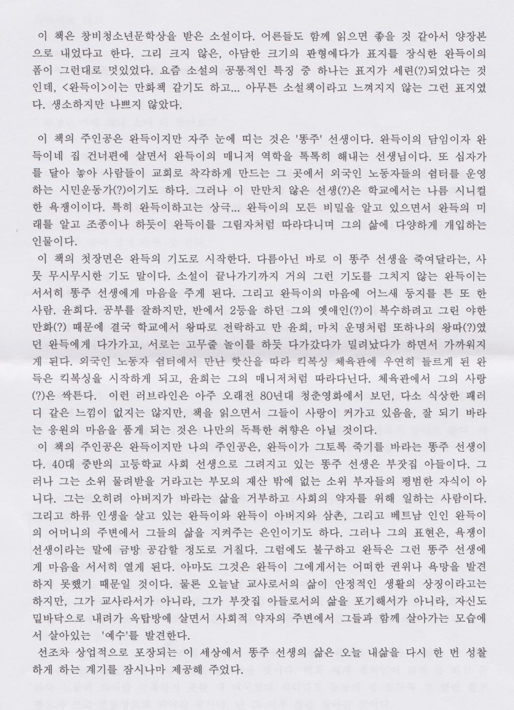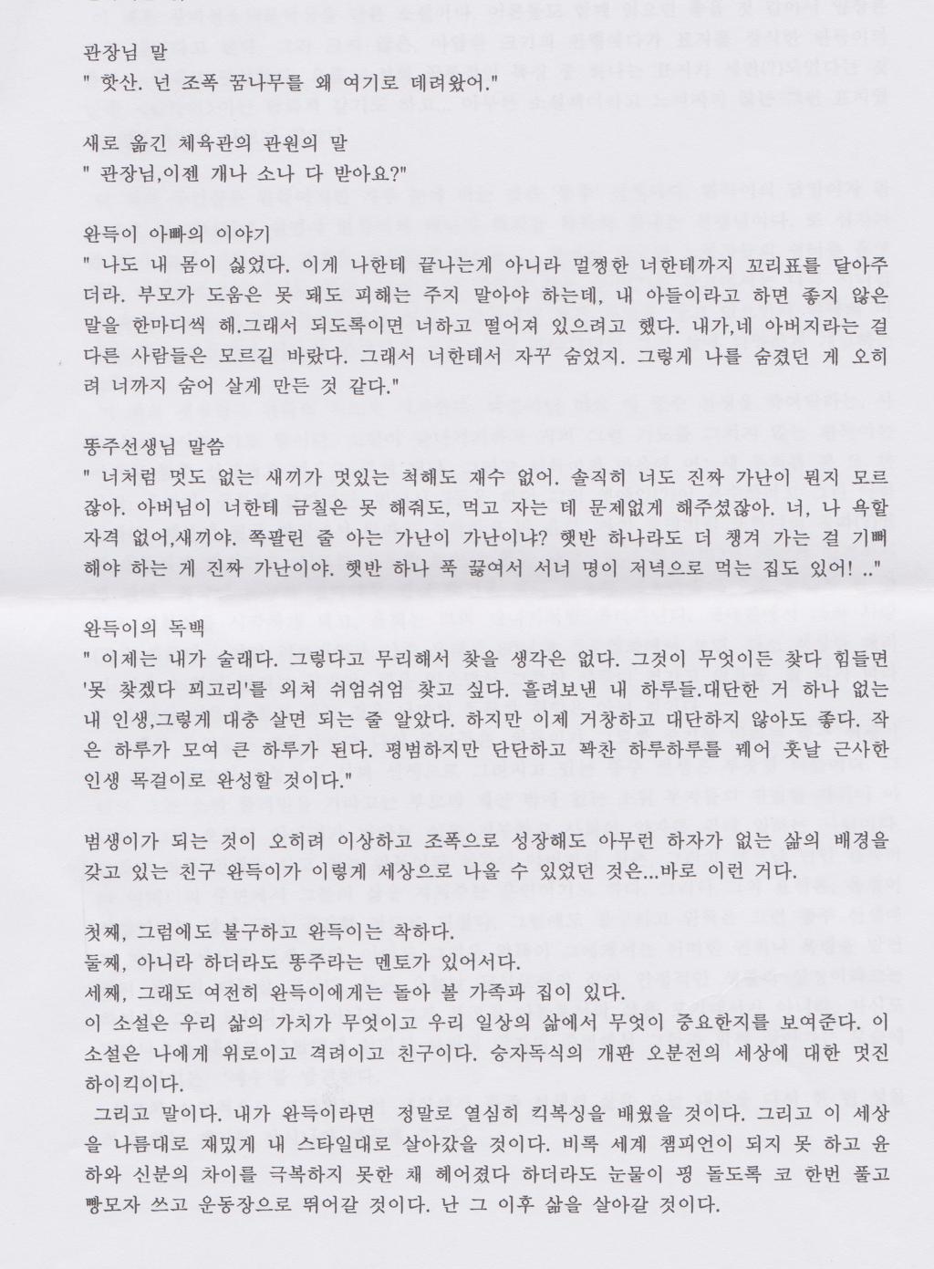 마지막으로 완득이가 빗나갈 수 있는 모든 조건을 다 가지고 있음에도 올곧게 삶이 나아가는 것은 무슨 요인 때문이냐는 질문에 친구들은 효심이 깊어서,똥주선생님이 있어서 라는 이야기를 했습니다. 이는 완득이가 태고난 성정이 착했을 것이고 그를 적절히 이끌 수 있는 멘토가 있었기 때문이라고 생각이 들었다. 특이 친구들은 똥주선생에 대한 존재감에 대해 크게 생각하는 것 같았다. 진정으로 자신들을 위해서 애써 주는 선생님을 맘 속으로 기대하고 있다는 것이겠다. 어른들이 특히 아이를 가르치는 선생님들은 분발하고 또한 분발할 일이라고 생각한다.