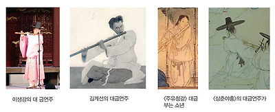 위 그림의 맨 왼편은 현존하는 대금연주가 이생강 명인의 2009년 창덕궁에서의 연주모습이고4) 두 번째는 20세기 초 한국을 방문했던 엘리자베스 키스가 그린 근세의 대금명인 김계선의 초상이며, 맨 오른쪽은 신윤복의 <상춘야흥>에 등장하는 대금연주가의 뒷모습이다.
