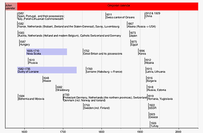 동유럽이 그레고리우스력을 채택한 시기가 동아시아 3개국(조선 1896년, 일본 1873년, 중국 1912년)보다 늦은 이유는 아마 이 달력 체계를 개발한 사람이 로마 가톨릭 교황이었다는 점 때문이 아니었을까 싶지만, 이 푸념과 벗어난 주제라 넘기겠다.
