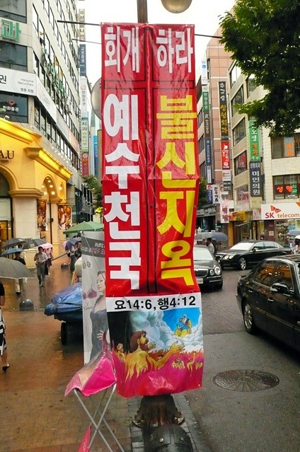"말도 마세요 오빠. 성당 다닌다고 해도 끝까지 쫓아오더라니까요. 온 몸에 그놈의 '예수천국, 불신지옥' 을 매달고 말이에요. 빨간 바탕에 노란색, 흰색 글씨를 써가지고는 멀리서도 눈에 확 띄는 그거, 아우......"
