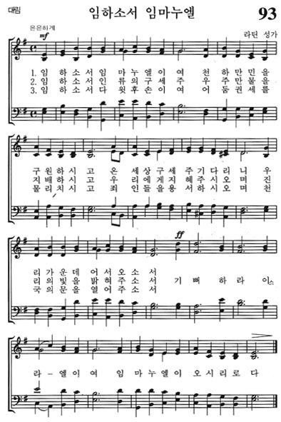 93번성가 - 임하소서 임마누엘 1) 임하소서 임마누엘이여 천하만민을 구원하시고 온 세상 구세주 기다리니 우리 가운데 어서 오소서 2) 임하소서 인류의 구세주 우주 만물을 지배하시고 우리에게 지혜 주시오며 진리의 빛을 밝혀주소서 3) 임하소서 다윗 후손이여 어둠 권세를 물리치시고 죄인들을 용서하시오며 천국의 문을 열어주소서 후렴 : 기뻐하라 이스라엘이여 임마누엘이 오시리로다이곳을 크릭☞93번성가 - 임하소서 임마누엘▷93번성가 - 임하소서 임마누엘