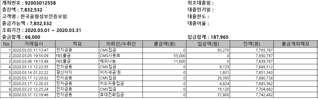 [┃월별재정현황┃]2020년 03월 재정내역 - 7,832,532원 작성자영빈|작성시간20.04.05|조회수133 목록 댓글 0 글자크기 작게가 글자크기 크게가 - 한국골형성부전증 국민은행 통장내역 -- 한국골형성부전증 CMS 정산내역 - 다음검색 현재 게시글 추가 기능 열기 북마크 공유하기 신고 센터로 신고 댓글 댓글 0 댓글쓰기 답글쓰기 댓글 리스트