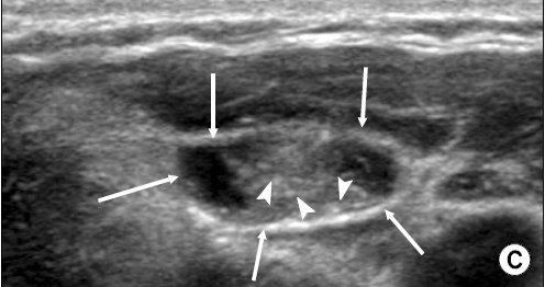 위 초음파 사진은 임파선에 갑상선 유두암이 전이된 것으로 둥그런 임파선(화살표) 안에 석회화 소견(작은 화살표) 을 보이고 있습니다.