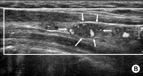 위 초음파 사진은 임파선 주위에 혈류 도플러 검사를 한 모습인데 임파선 주위로 혈관들이 비정상적으로 많이 발달해 있습니다.