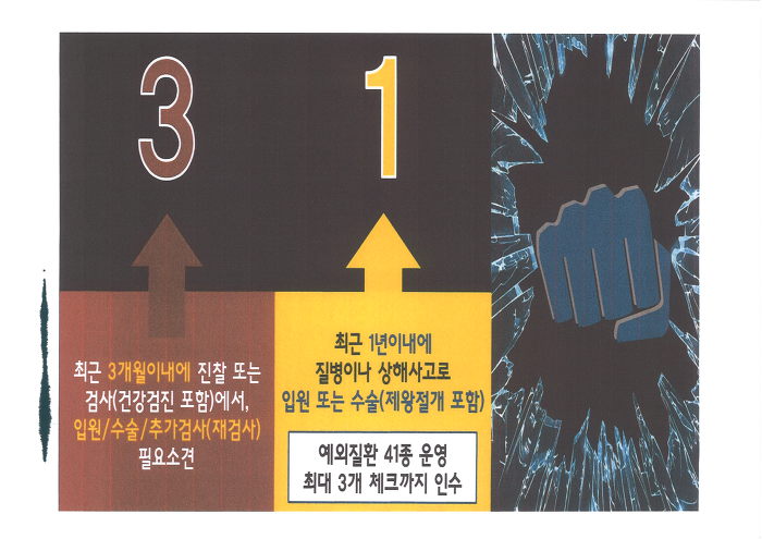 하지만 1년 이내에 가벼운 질환으로 입원이나 수술하신 분들에게는 불합리할수도 있다는 판단하에 예외질환 41종을 두었습니다.