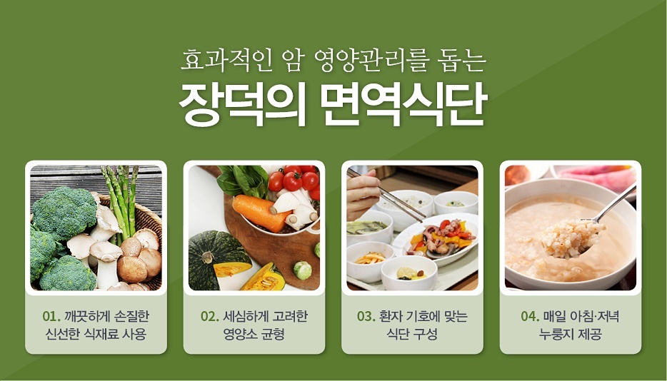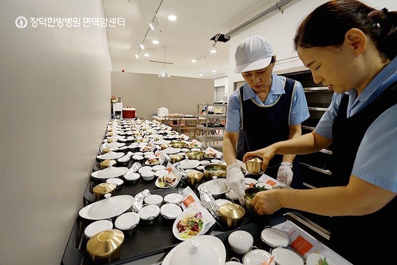 _ 4명의 호텔 출신 셰프와 영양사 등이 조리팀 모두가 정성을 쏟으며 식사를 제공해드리고 있으며, 이런 면역 식단 제공을 통해 환자분들께서 혼자 관리를 하기 힘든, 암에 좋은 식단을 편리하게 섭취하실 수 있게 면역 식단 제공을 통해 도움을 드리고 있습니다.