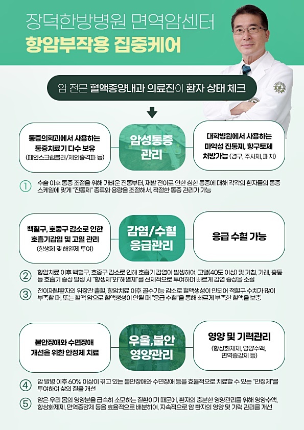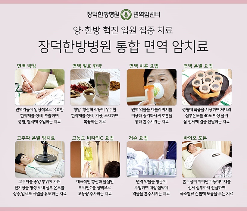 장덕한방병원 면역암센터는 유방암 말기증상 관리의 시행을 위해 환자분들의 인체 내 면역력을 활성화시키고 면역 체계를 강화시키는 양방과 한방의 통합 면역암치료를 진행합니다.