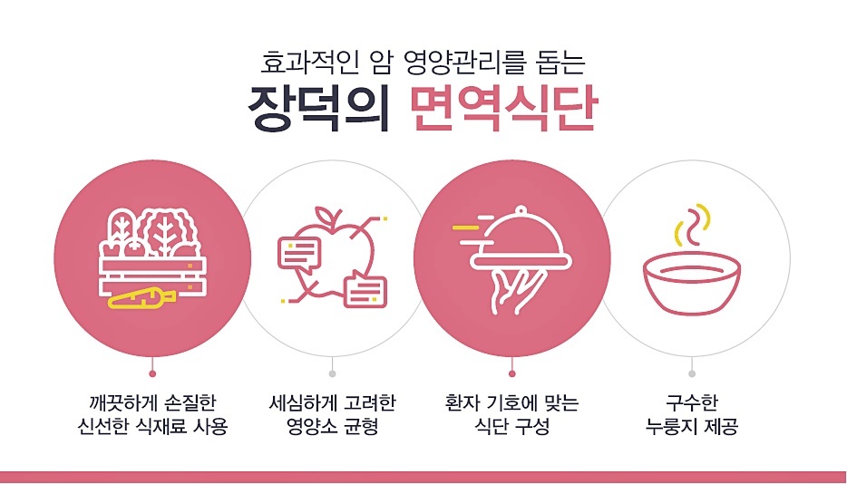 암 환자분들을 위해 면역 식단을 아침, 점심, 저녁으로 제공합니다. 이러한 면역 식단은 과학적인 근거를 기반으로하여 하여, 식물성 생리활성 물질인 파이토 케미컬이 풍부하게 함유되어 있는 , 양질의 단백질로 구성된 채소 위주의 식단 구성함으로서 환자분들께서 맛있고 건강한 식이 관리에 있어서 도움 드리고 있습니다.