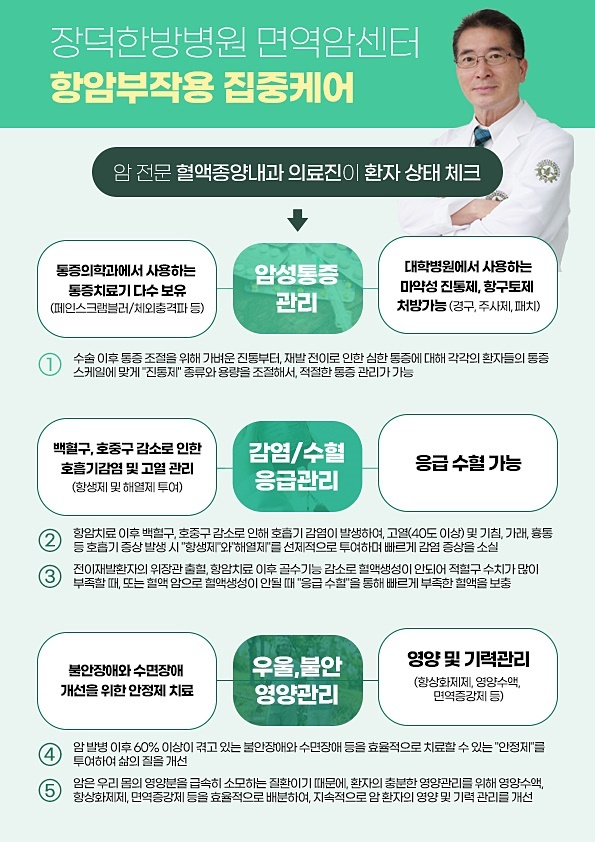 장덕한방병원 면역암센터는 환자의 증상과 진단에 따른 환자 맞춤 치료를 진행합니다. 이는 환자의 떨어진 면역력을 증진시키고 항암 및 방사선 치료 후에 발생할 수 있는 부작용을 완화하려는 목적이며, 잔여 종양 퇴축을 유도하고자 합니다. 환자 개개인에게 최적화된 치료 계획에 따른 지속적인 관리를 제공하고자 노력합니다.
