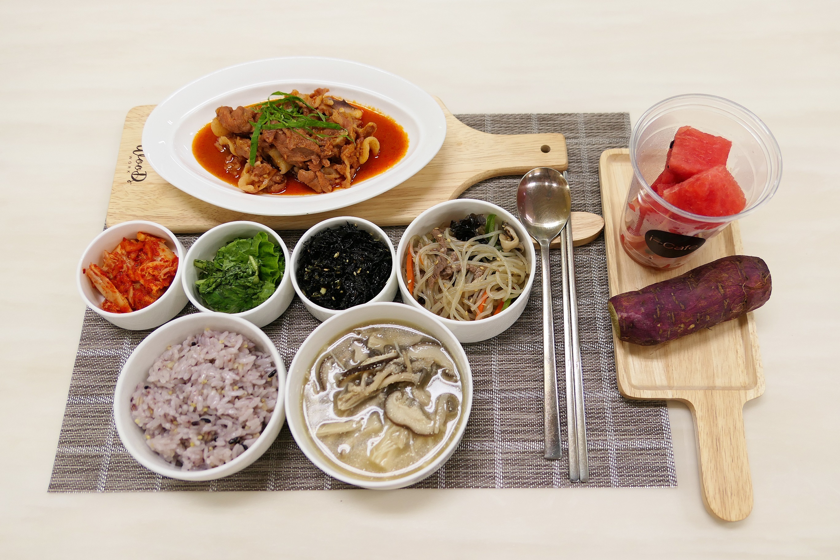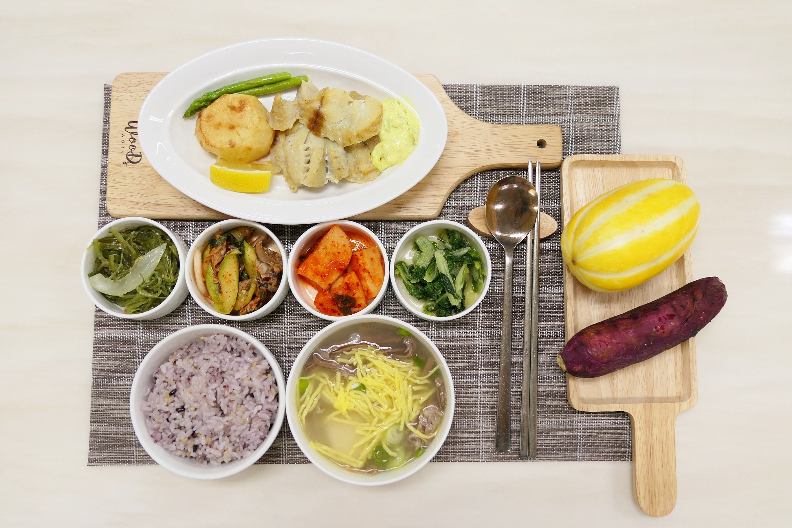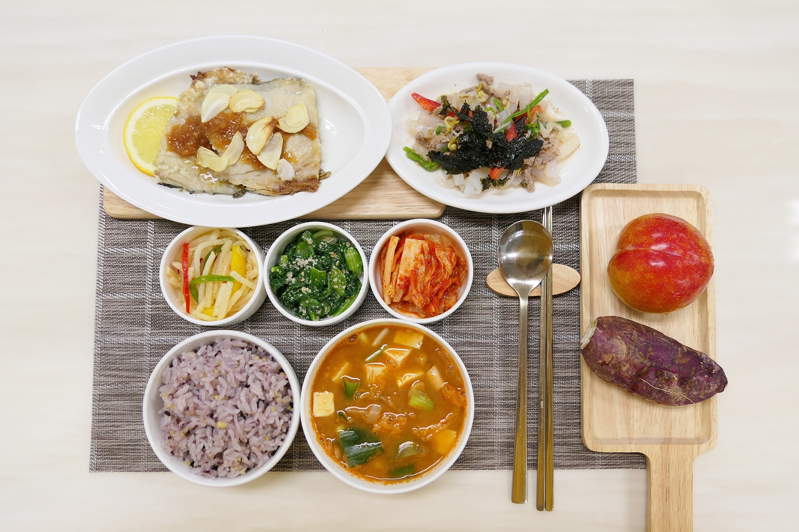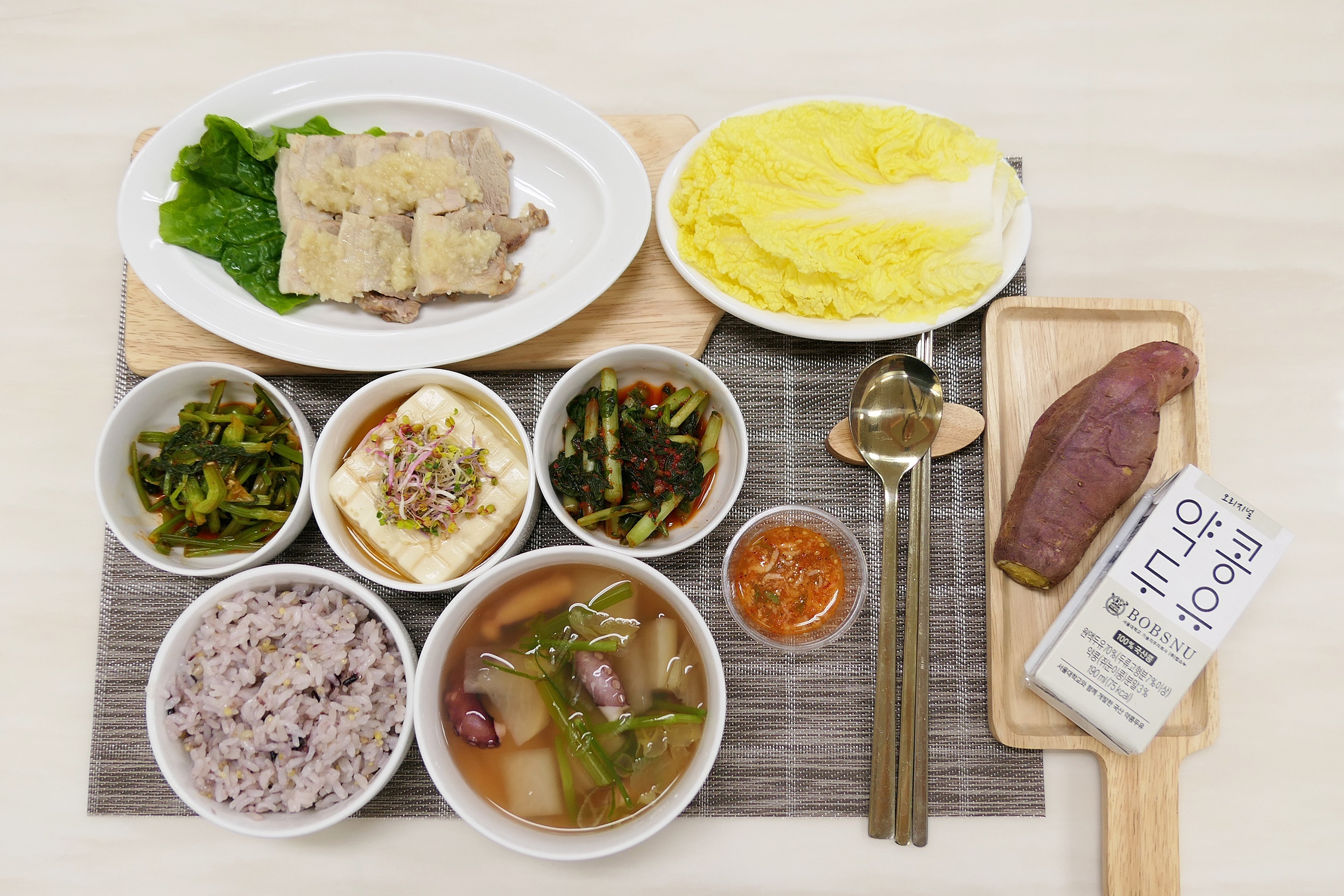 04) 상차림 구성에 고구마와 바나나, 자연주스 등을 간식으로 제공합니다.