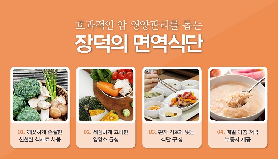장덕 면역암센터의 면역 약선 식단은 과학적인 근거를 바탕으로 둔 양질의 단백질과 식물성 생리활성물질인 파이토케미컬이 풍부한 채소 중심의 식단으로 구성되어 있습니다. 맛과 다양성, 객관적인 식이를 제공하고자 암 영양사들과 1등급 호텔 메인 셰프들이 하나의 팀이 되어 항암 식단을 집중적으로 연구하고 있으며, 다음과 같은 식이요법을 식단에 전면 도입하고 있습니다.