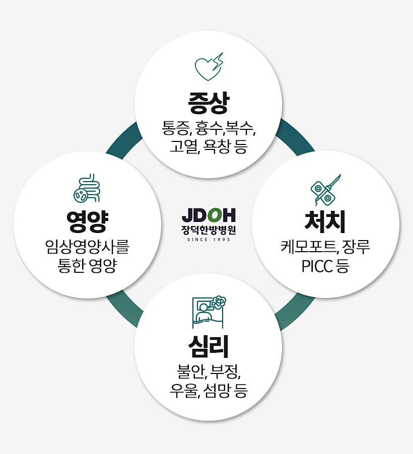 본원에는 혈액종양내과 의료진이 환자의 상태를 직접 확인하고 케어하는 항암 부작용 집중 케어를 진행하고 있습니다. 크게 암성 통증 관리와 감염 및 수혈 등의 응급관리 그리고 우울, 불안 및 영양 관리 등이 진행됩니다. 또한 말기 암 환자에서 흔히 나타나는 욕창, 복수, 고열 등의 증상을 관리하는 데 도움을 드립니다.