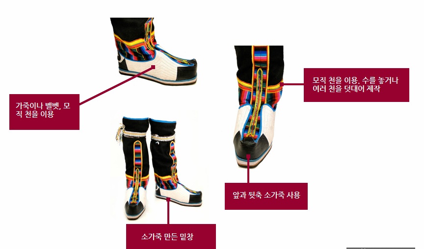 신발 밑창은 소 가죽 여러 장을 붙여 만들고 앞과 뒷축도 가죽을 사용합니다. 신발 발등 위로는 앞치마 제작에 사용되는 모직 천을 덧대어 사용하거나 무늬로 수를 놓기도 합니다.