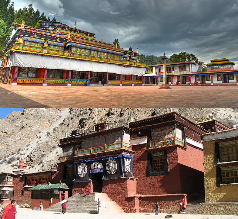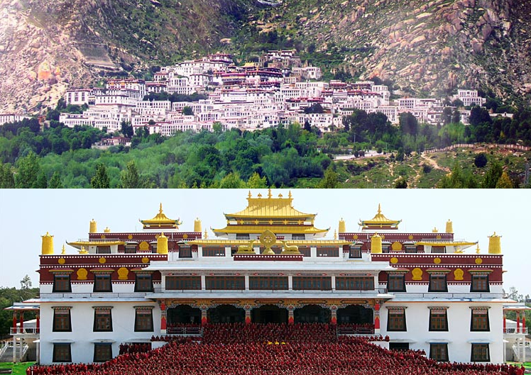 티베트 라싸 근교에 있는 데뿡사원(上), 인도 남부 문고드(Mungod)에 새로 설립한 데뿡 로셀링 사원(下)