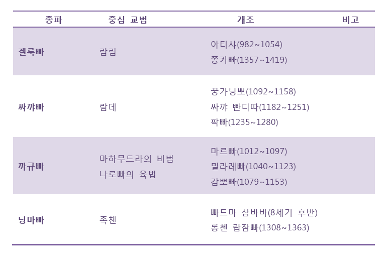 주요 종파는 가장 오래된 '닝마빠'와 새로운 사람들이란 뜻인 '싸르마빠'로 크게 분류합니다. 우리 표현으로하면 구파(舊派)와 신파(新派)인 셈입니다. 이는 소의로 하는 밀교 경전에 따라 구별하는데 왕국 시대에 이미 번역되어 있었다고 간주되는 고역(古譯)과 이후 전파기에 새로이 번역된 신역(新譯)이 있는데 닝마빠는 전자를 소의경전으로 하고 싸르마빠에 속하는 '까규빠', '싸꺄빠', '겔룩빠'는 신역을 소의경전으로 합니다.