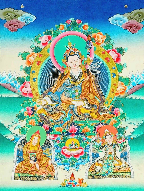 인도 우디야나 출신의 대 밀교행사 빠드마삼바바(=구루린포체). 아래 두 사람은 싼타락시타(왼쪽)와 티베트 왕 티쏭데첸이다. 8세기 불 법 승을 갖춘 최초의 티베트 불교 사원 쌈애사를 건립한 구루린뽀체는 티베트 민중에 널리 존숭되고 있다.
