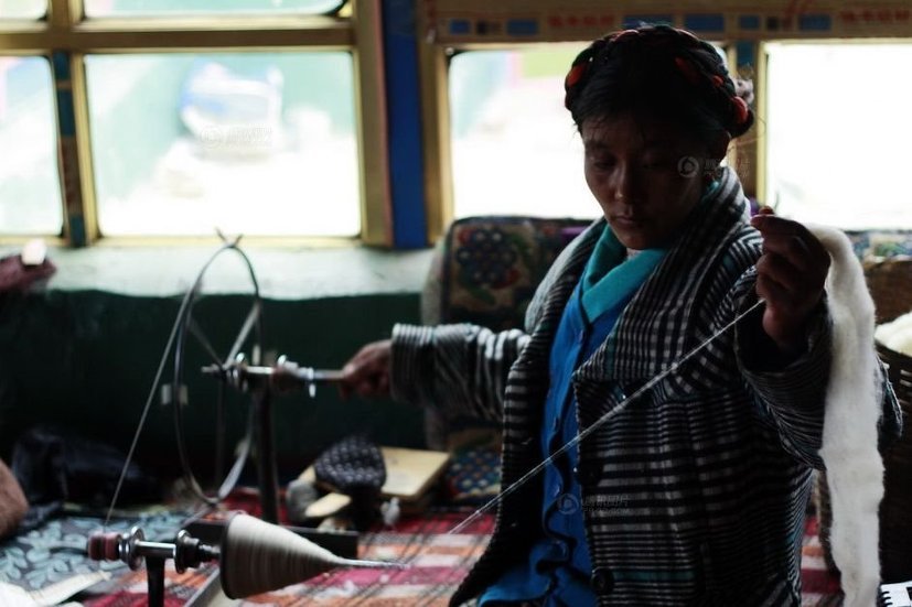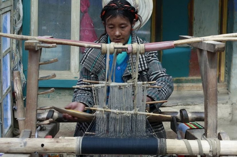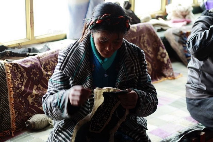 점심 식사 후 바쁜 오후를 보내고 있는 빼마씨입니다. 베틀을 이용해 티베트 전통 앞치마인 '빵덴'을 짜고 있습니다. 빵덴은 모직이나 비단 등으로 다양한 색상을 만듭니다. 다양한 색상의 빵덴은 라싸와 인근 지역에서는 주로 결혼한 여성들이 착용합니다.