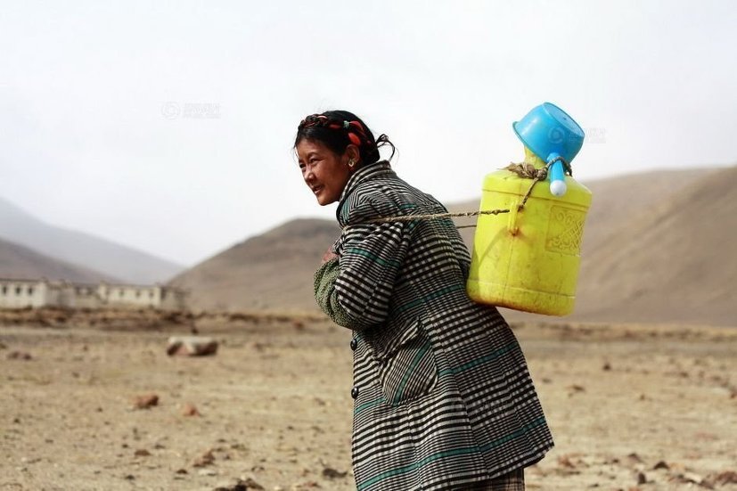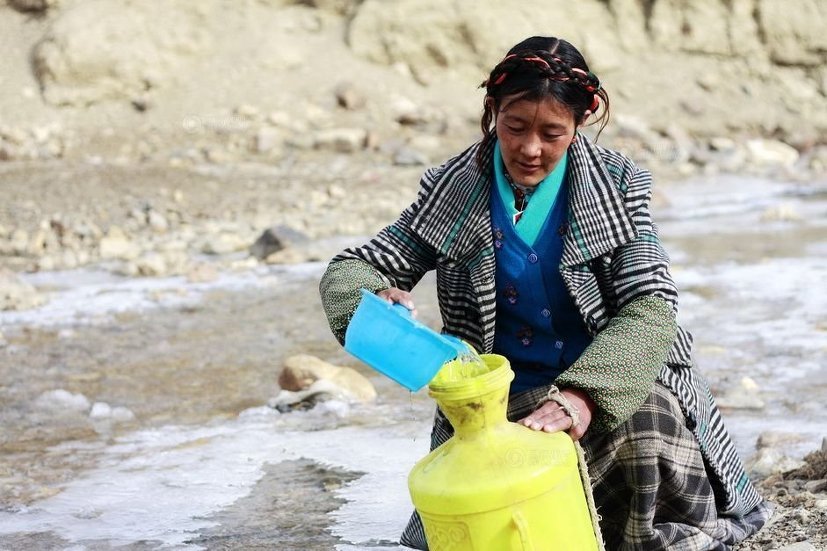 티베트 농촌에는 집안에 수도시설이 없는 농가가 적지 않습니다. 빼마씨 집 근처 개울가에서 물을 담고 있습니다.