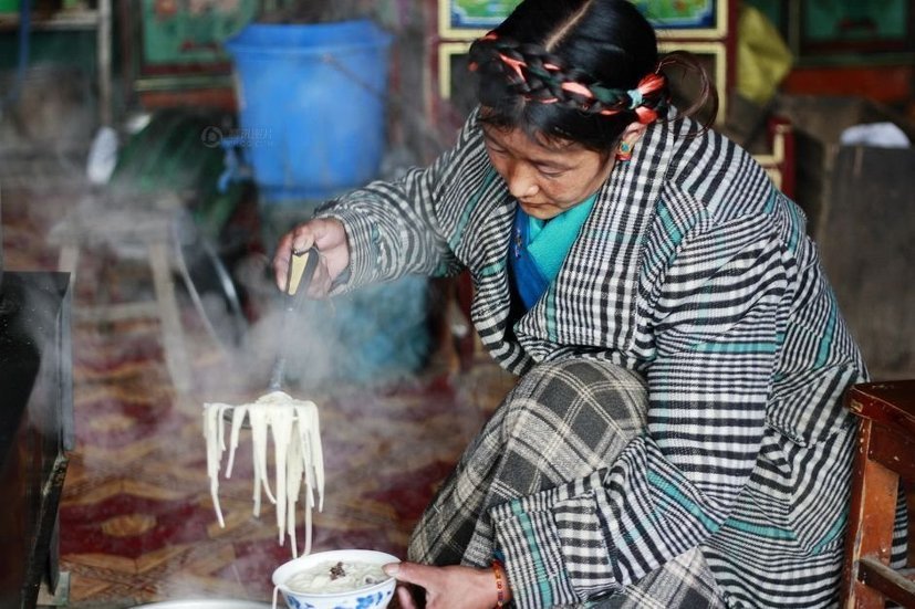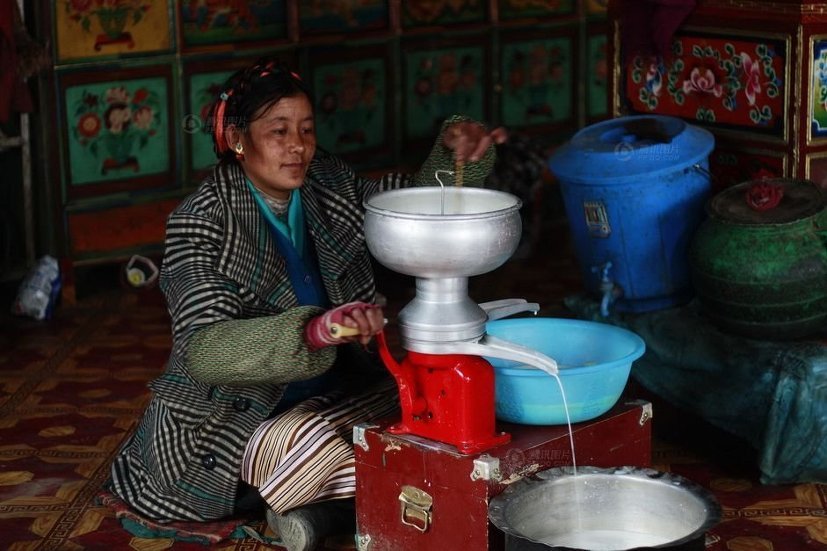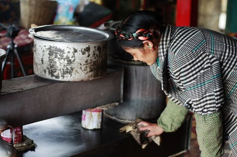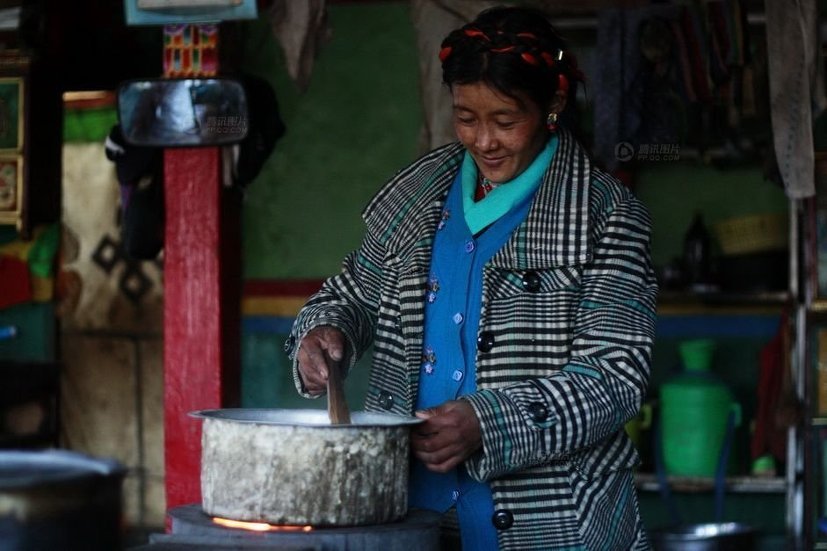 티베트 농촌의 하루는 일찍 시작됩니다. 부엌에 있는 요리 겸용 다목적 난로를 제외하고는 이렇다 할 난방시설이 없어 추위가 물러나지 않은 봄에도 옷을 두텁게 입고 있어야 합니다. 우유로 음식을 준비하는 주부.