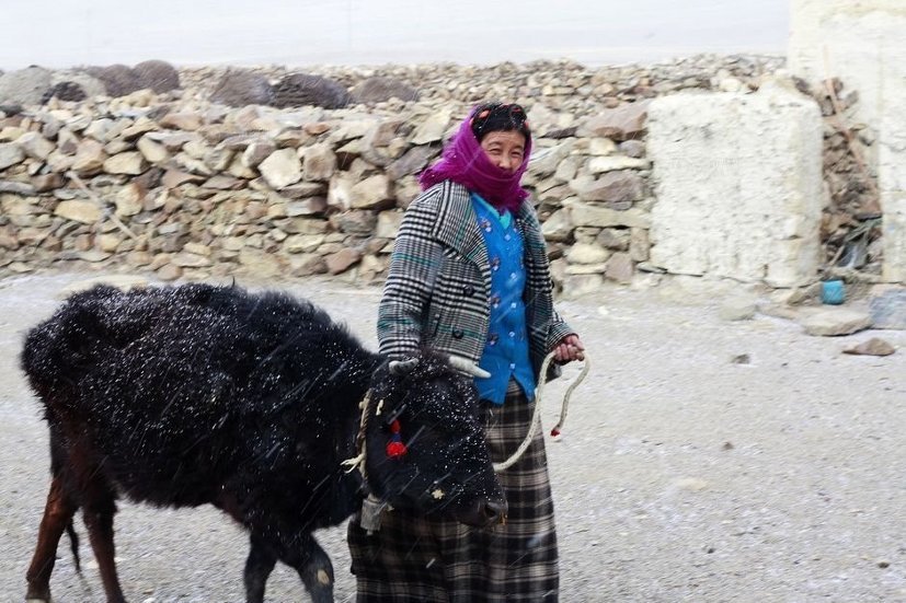 눈발이 날리자 어린 소를 안으로 데리고 갑니다. 티베트 중부의 전형적인 농가 1층에 가축들의 쉼터가 마련되어 있습니다.